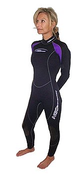 Flexibility neoprene - Stylish design! - Fluid neoprene - Adjustable neck seal Back zipper - Durable heavy duty rubber knee pads - Glued and blindstitched seam - Black with lavender highlights - 7/5mm design to optimize warmth with comfort - This NeoSport 7mm/5mm Full Suit is a fabulous wetsuit for staying warm in colder waters while having maximum flexiblity.